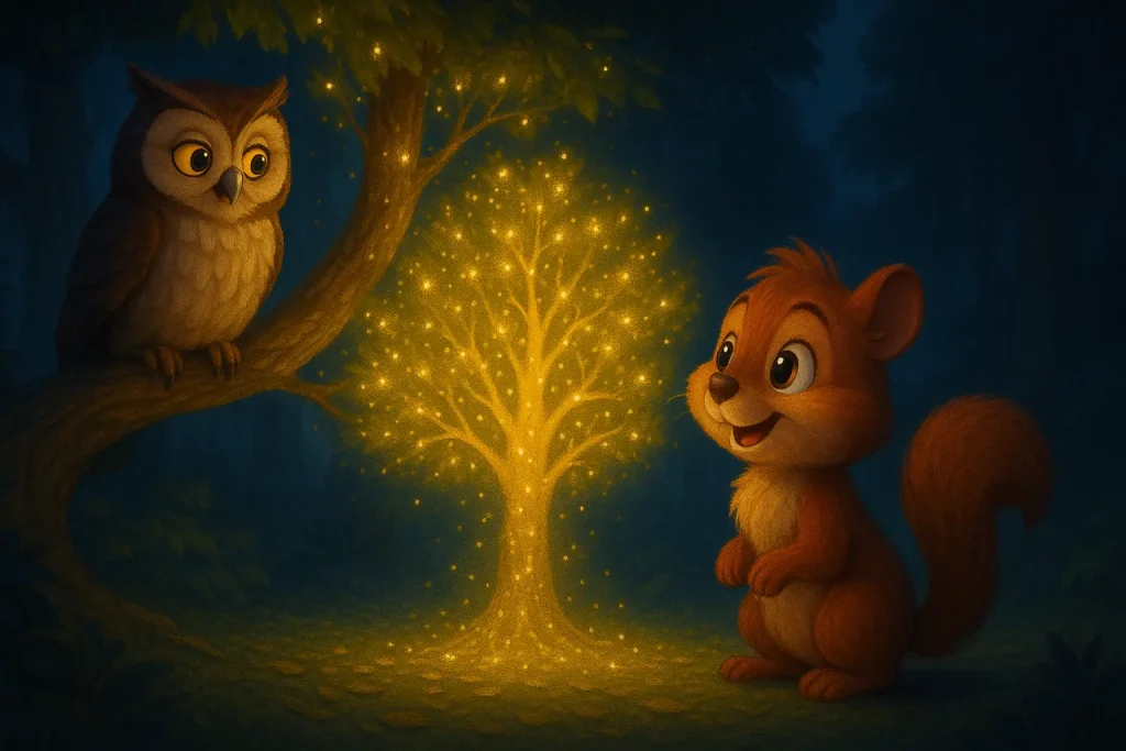Bir süre yürüdükten sonra, Tofi küçük bir açıklığa varır. Orada, parıltının kaynağı gibi görünen bir ağaç durmaktadır. Gövdesi hafifçe ışıldayan bu ağacın dallarında, minik minik parlayan yapraklar sallanmaktadır.