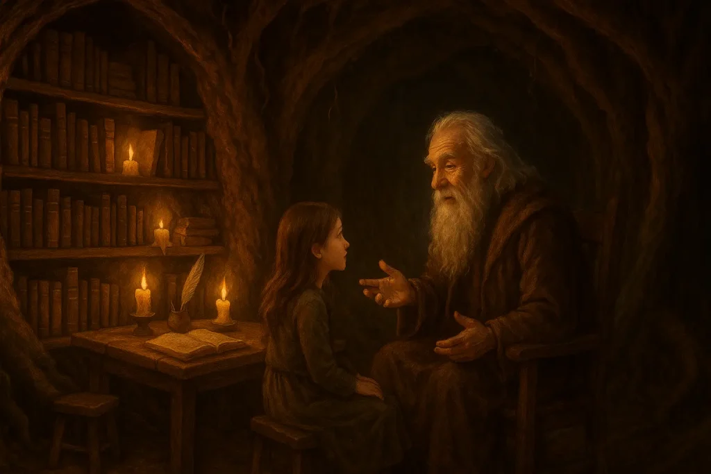 Elif iyice meraklanmış. Bilge Rüzgar onu bir ağacın gövdesine oyulmuş küçük bir odaya götürmüş. İçeride yüzyıllık kitaplar, haritalar ve eski mürekkep şişeleri varmış.